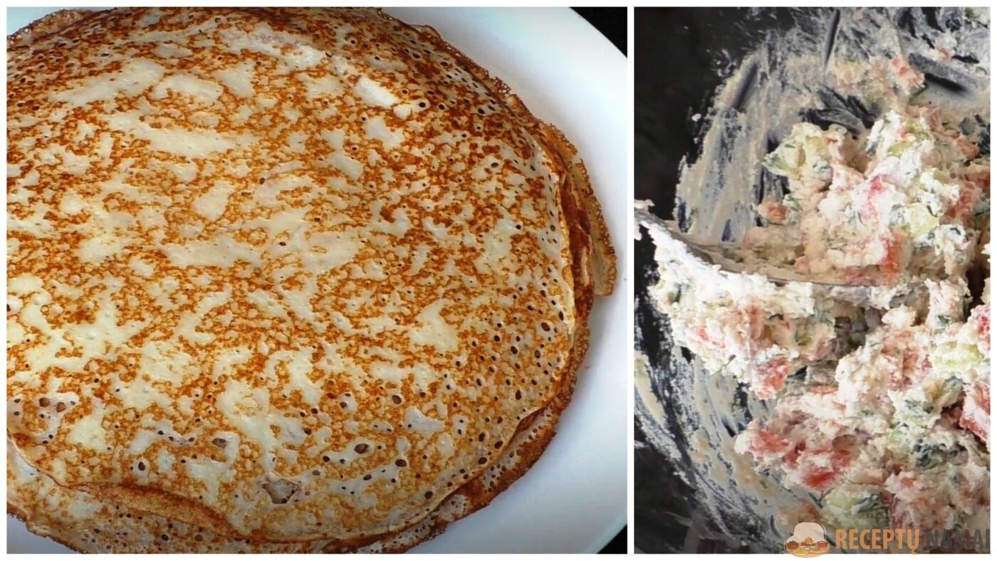Tai gardūs blyneliai su raudona žuvimi.
