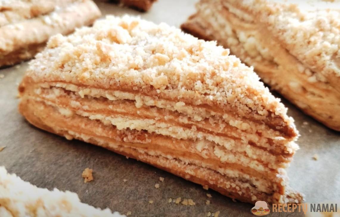 . Ant pirmojo lakšto dėkite ¼ trupinių, uždenkite antruoju lakštu. Ant antrojo
