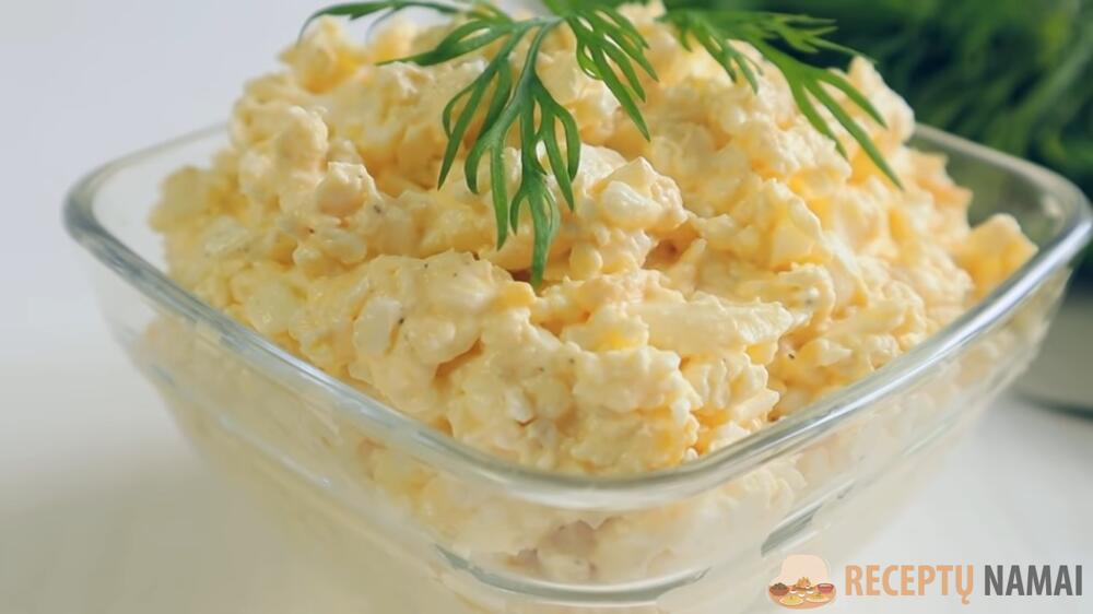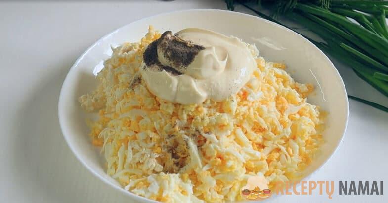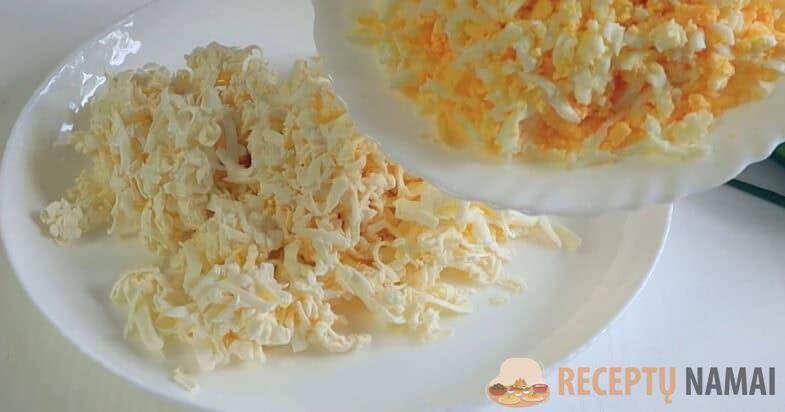 : sutarkuoju lydytą sūrį ir virtus kiaušinius.