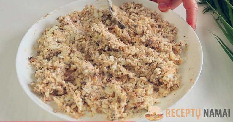 Česnaką išspaudžiu per presą. Apšlakstau majonezu, pagal skonį įberiu druskos, pipirų ir viską išmaišau.