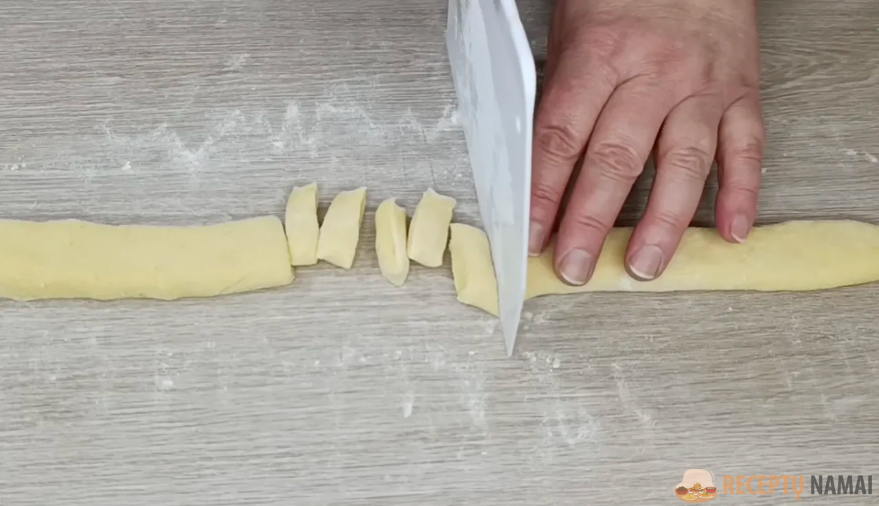 Paruošta masė paskleidžiama ant lengvai miltais pabarstyto stalo ir greitai minkoma rankomis iki vientisos masės. Tešla padalinama į dalis, suformuojamos ilgos „dešrelės“ ir supjaustomos norimo dydžio gabalėliais – forma gali būti bet kokia.