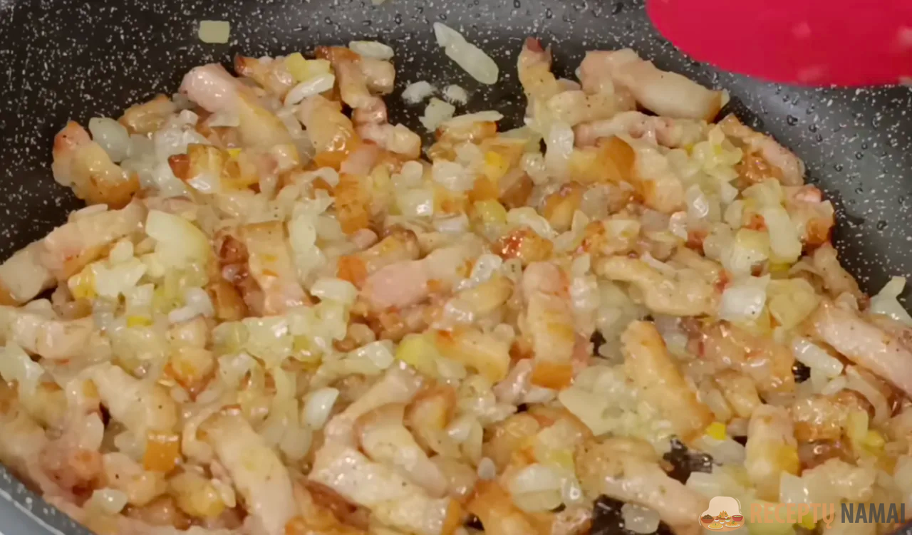 Skruostas (arba šoninė, krūtinėlė arba taukai su mėsingu sluoksniu) supjaustomi mažomis juostelėmis, kad kiekvienas gabalėlis būtų gerai jaučiamas gatavame patiekale. Į keptuvę įpilkite augalinio aliejaus, paskleiskite mėsą ir lėtai kepkite ant vidutinės ugnies, kol gražiai apskrus. Svogūną supjaustykite kubeliais ir sudėkite į keptuvę. Viską kepkite kartu, kol gražiai apskrus. Pabaigoje padažą lengvai pasūdykite ir papipirinkite, tada atidėkite.