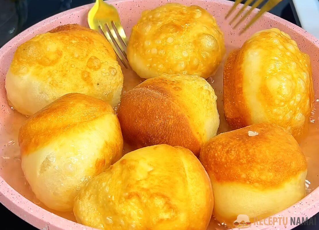 - Dėkite būsimus bauburėlius į įkaitintą aliejų ir kepkite iš abiejų pusių po 3-4 minutes, kol taps auksinės spalvos.
