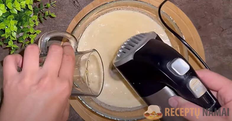 Kiaušinius su druska išplakiau mikseriu, tada plona srovele subėriau cukrų. Tada sudedu vaniliną, kefyrą ir sviestą, vėl išplaku mikseriu.