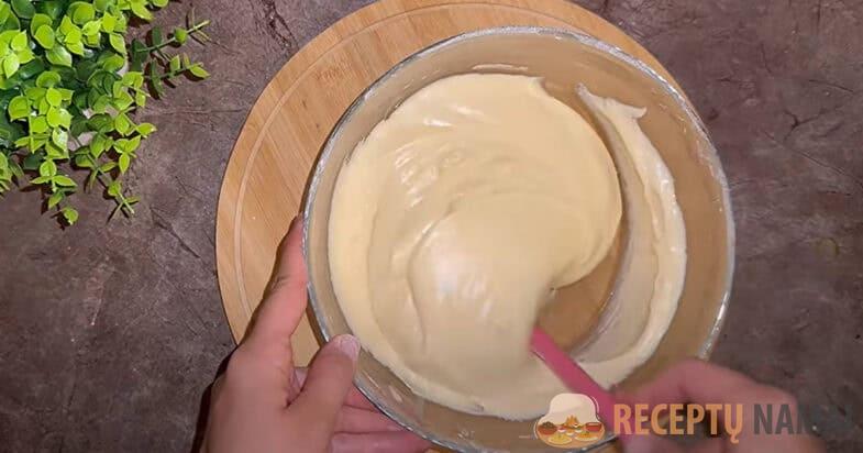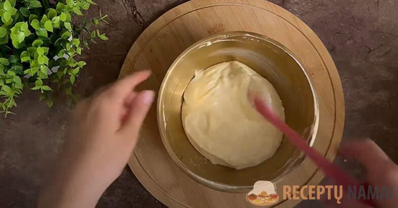 Galiausiai supilu miltus ir kepimo miltelius, išminkau iki vientisos vientisos tešlos.