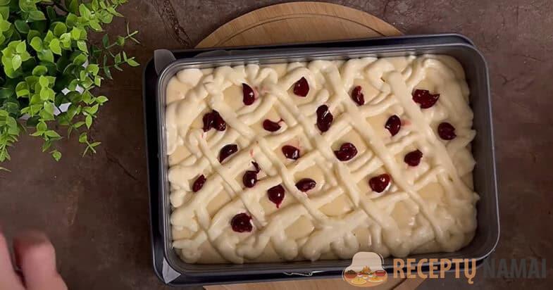 Tešla pripildau pergamentinę formą, tada ant viršaus užtepu varškės mišinio tinklelį. Įdedu vyšnių. Kepu 180° temperatūroje, kol iškeps.
