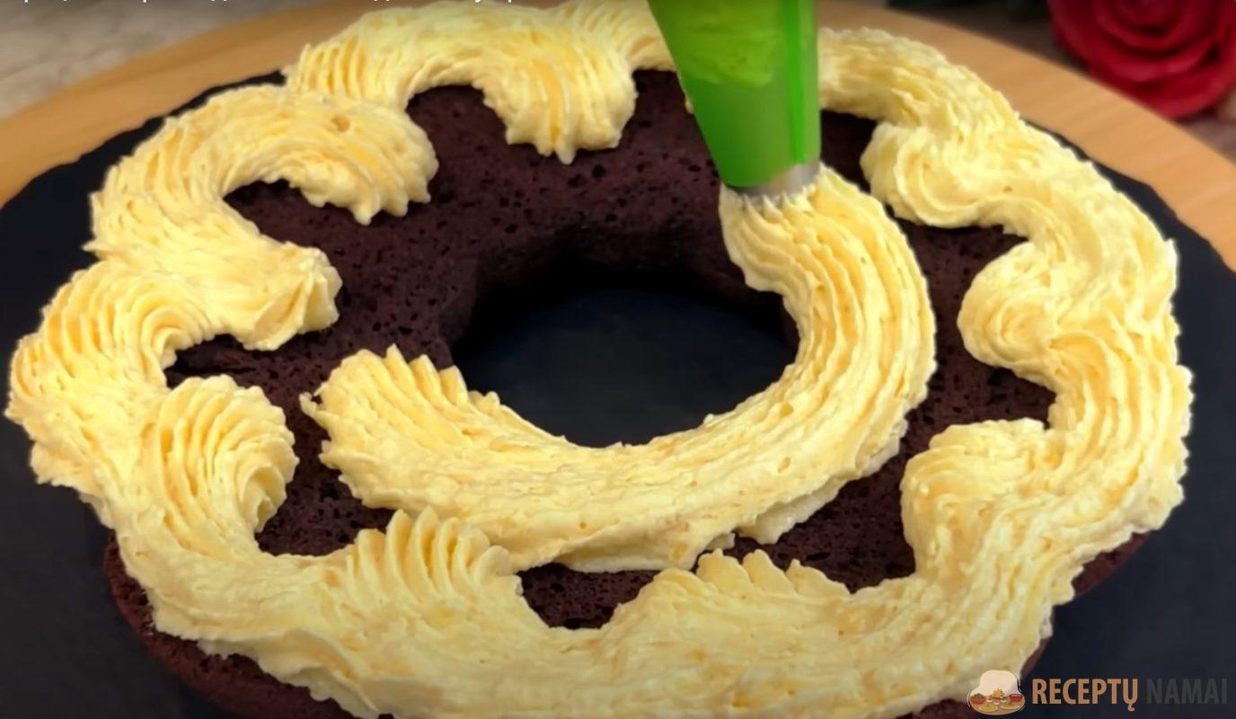 Kremo sluoksnį uždenkite antruoju tortu ir papuoškite tortą juoduoju šokoladu, iš anksto ištirpintu vandens vonelėje.