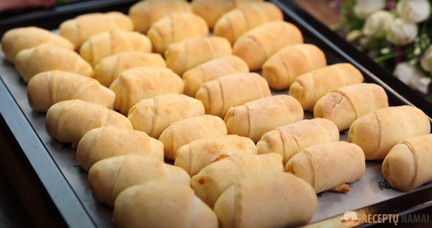 . Ant kiekvieno trikampio plačiosios dalies dėkite įdaro ir suvyniokite į ritinį.