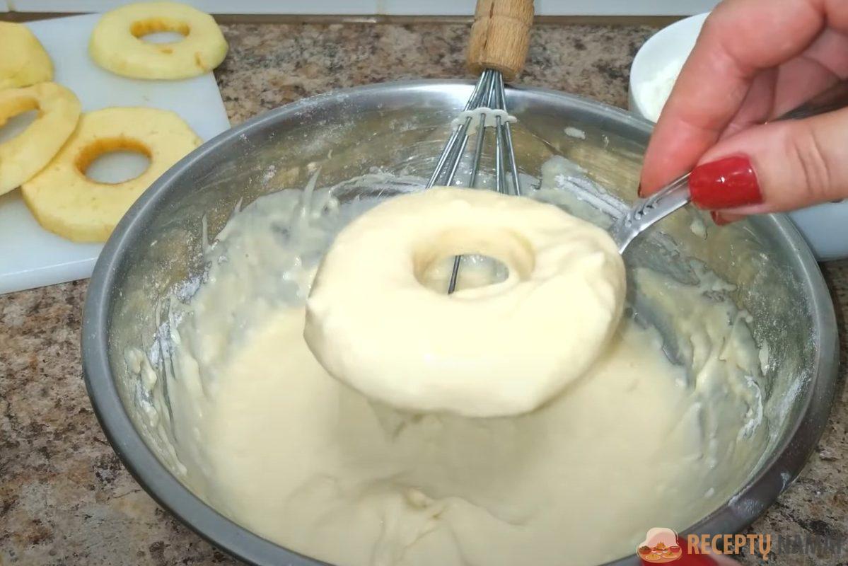 . Kiekvieną obuolio apskritimą apvoliokite tešloje. Keptuvėje įkaitinkite augalinį aliejų ir sudėkite obuolius į tešlą.