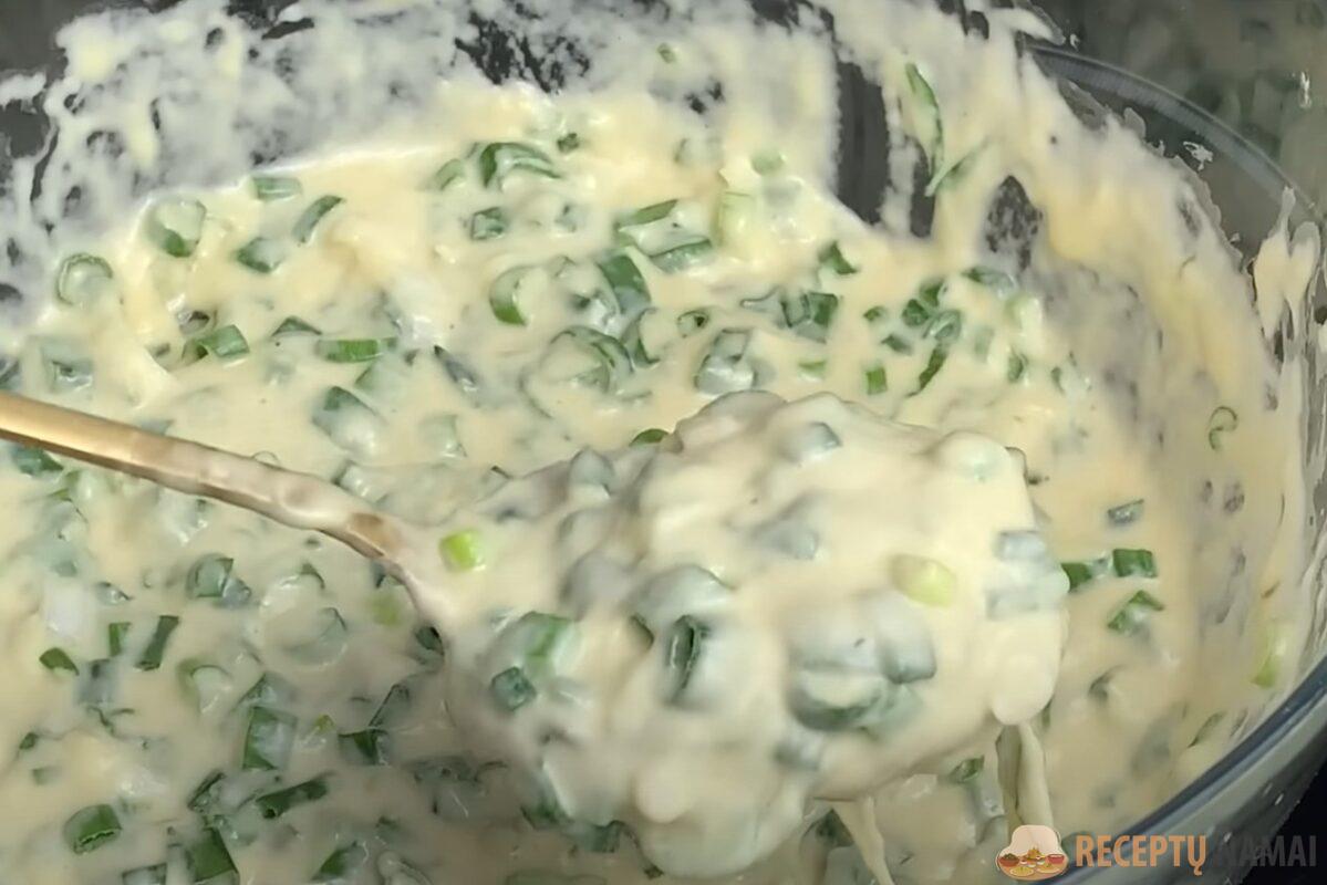 . Sumaišykite miltus ir sodą, persijokite į kiaušinių masę. Užminkykite tirštą tešlą, supilkite į ją susmulkintus žaliuosius svogūnus, išmaišykite ir palikite 15 minučių karštyje.