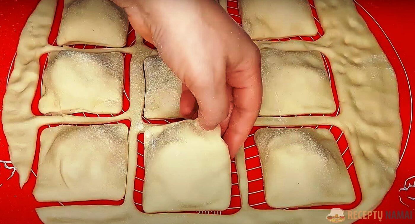 Uždenkite porcijas antruoju sluoksniu ir paspauskite tarp jų esančius tarpus, kad tešla susilietų. Pjaukite išilgai įspaustų tarpų, neliesdami įdaro – gausime kvadratinius paplotėlius.