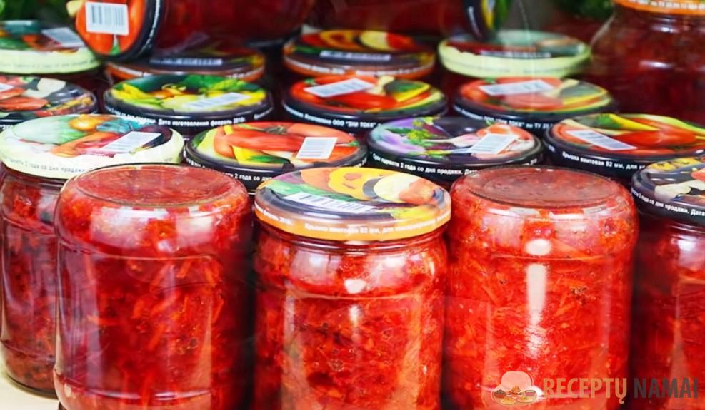 Burokėliai ir morkos sutarkuojami stambia tarka, pipirai supjaustomi gabaliukais, svogūnai – kubeliais.