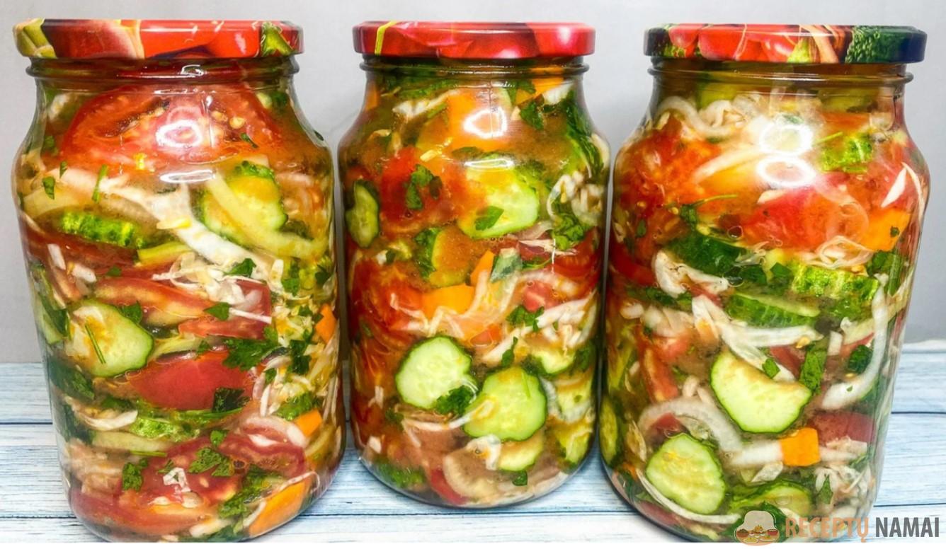 Kopūstai smulkiai supjaustyti, svogūnai supjaustyti plonais pusžiedžiais, saldžiosios paprikos griežinėliais, pomidorai plonais griežinėliais