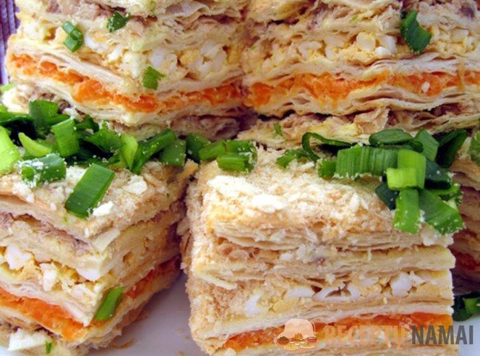 Kiaušinius išvirkite ir smulkiai supjaustykite, svogūnus ir morkas supjaustykite ir patroškinkite, sūrį sutarkuokite. Ant pirmo torto sluoksnio dedame tarkuotą sūrį sumaišytą su majonezu. Ant kito sluoksnio pakepinti ir šiek tiek atvėsinti svogūnai ir morkos, apšlakstyti majonezu. Ant kito pyrago sluoksnio dėkite sluoksnį susmulkintos žuvies konservų ir apšlakstykite majonezu. Kitas sluoksnis – kiaušiniai, sumaišyti su majonezu. Paskutinę sluoksniuotą tešlą galima papuošti trynių trupiniais, smulkiai pjaustytomis žolelėmis, tarkuotu sūriu, taip pat galima lengvai apibarstyti majonezu. Tortas turi pastovėti per naktį, tada jis taps minkštesnis.