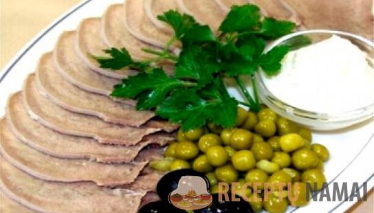 Supjaustykite liežuvį ir patiekite su šviežiomis žolelėmis ir garstyčiomis.