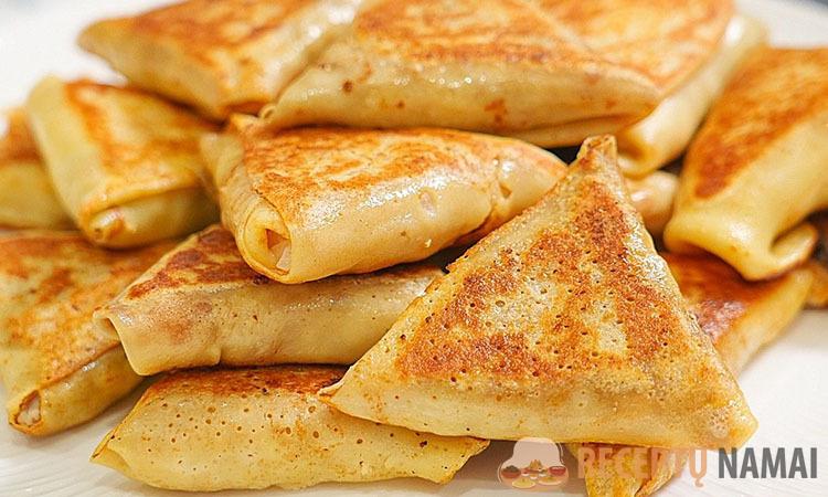 Pagal skonį įberkite druskos ir pipirų. Kepkite blynelius ant įkaitintos keptuvės, pateptos taukais arba augaliniu aliejumi, kol iškeps iš abiejų pusių. Kiekvieną blynelį perpjaukite pusiau, dėkite ant jų po šaukštą maltos mėsos, susukite į trikampius.