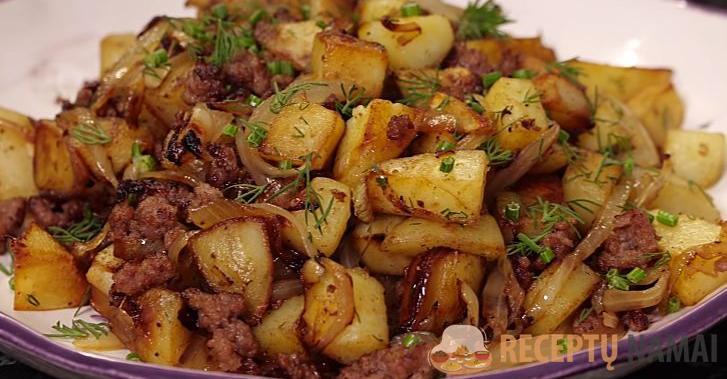 Perkelkite faršą į pirmoje keptuvėje išvirtas bulves.