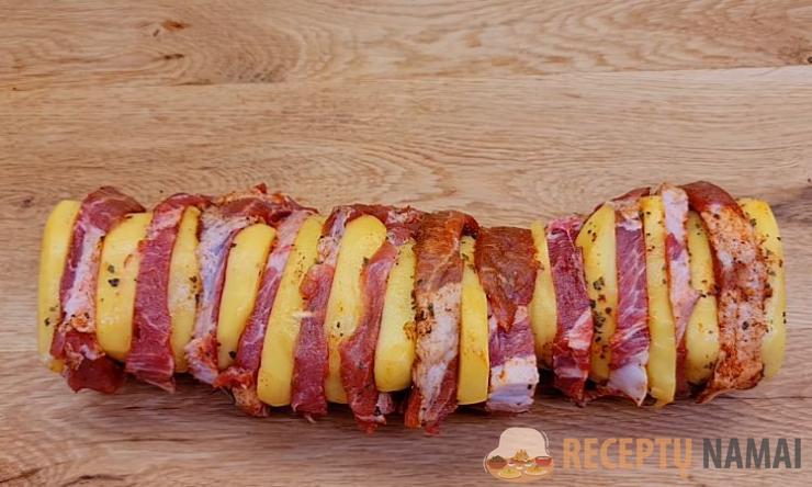 Sultingas ir skanus, kaip iš kepsninės, bulvių ir kiaulienos kebabas iš orkaitės paruoštas.