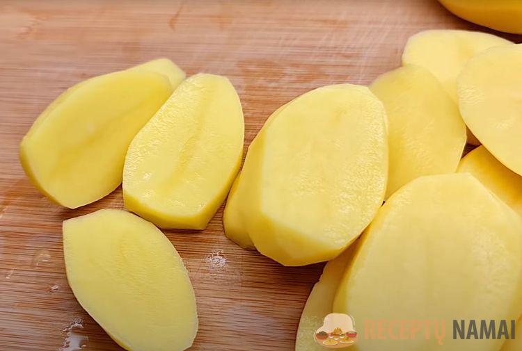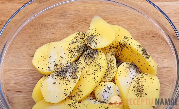 1. Nuluptas bulves supjaustykite skersai stambiais griežinėliais, pasūdykite, įdėkite džiovintų bazilikų ir išmaišykite. Jei norite, galite paeksperimentuoti su prieskoniais, kad patiekalas būtų aštresnis ar aštresnis.