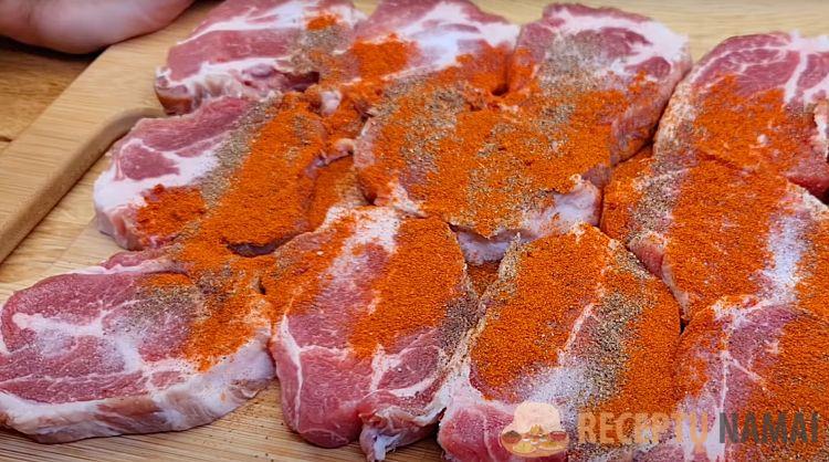 2. Kiaulieną supjaustykite panašaus storio gabalėliais kaip bulvės (apie 1 cm), iš abiejų pusių pabarstykite druska, pipirais ir paprika, tada viską patrinkite rankomis, kad mėsa tinkamai įsigertų.