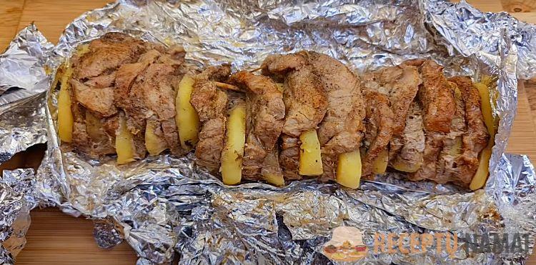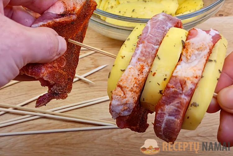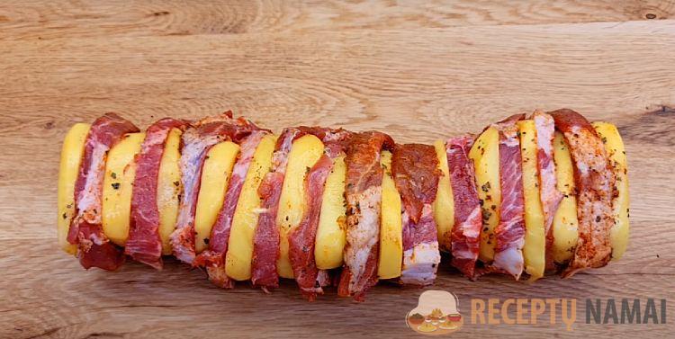 Sultingas ir skanus, kaip iš kepsninės, bulvių ir kiaulienos kebabas iš orkaitės paruoštas.