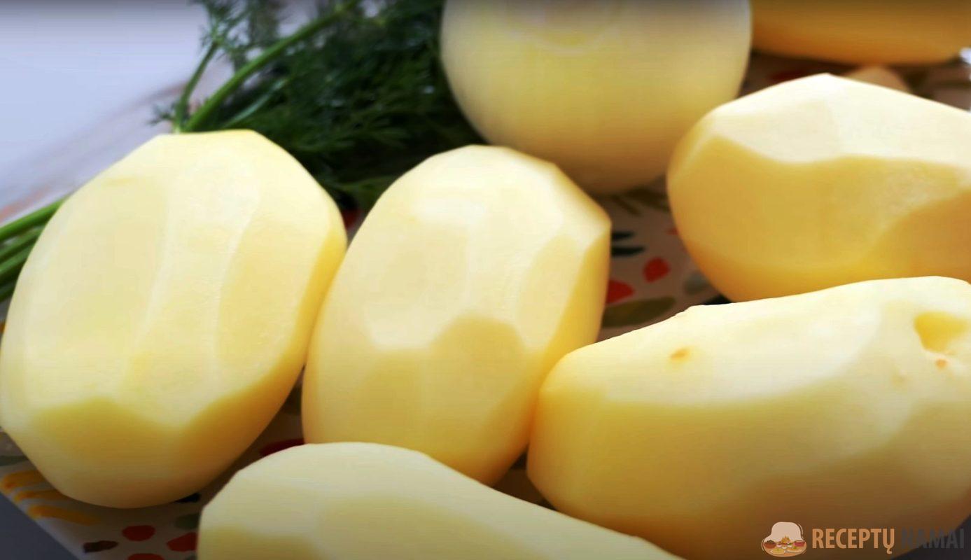Bulves nulupkite, supjaustykite, sudėkite į puodą kartu su ½ šaukštelio druskos, pora česnako skiltelių, lauro lapu ir juodaisiais pipirais. Bulves virkite, kol suminkštės