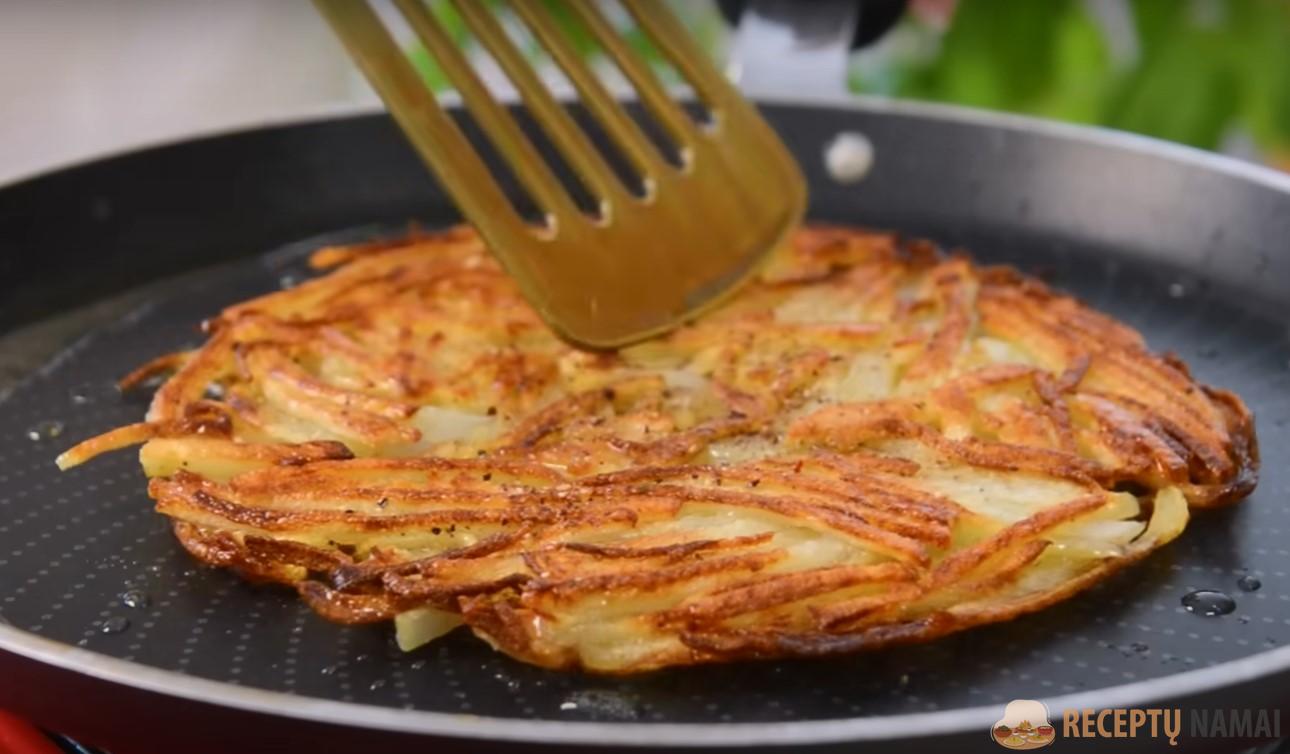 . Sudėkite šiaudelius į krūvą, kad susidarytų plokštainis. Kepkite bulvių draniką iš abiejų pusių, kol įgaus auksinę plutelę, nepamirškite pasūdyti ir pagardinti pipirais.