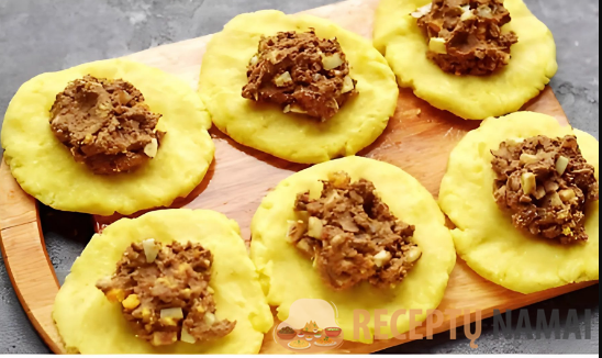 Bulvių tešlą padalykite į porcijinius gabalėlius, kiekvieną jų iškočiokite į maždaug centimetro storio sluoksnį. Į vidurį dėkite didelį šaukštą įdaro, tada atsargiai užspauskite kraštus, kad gautųsi pailga forma.