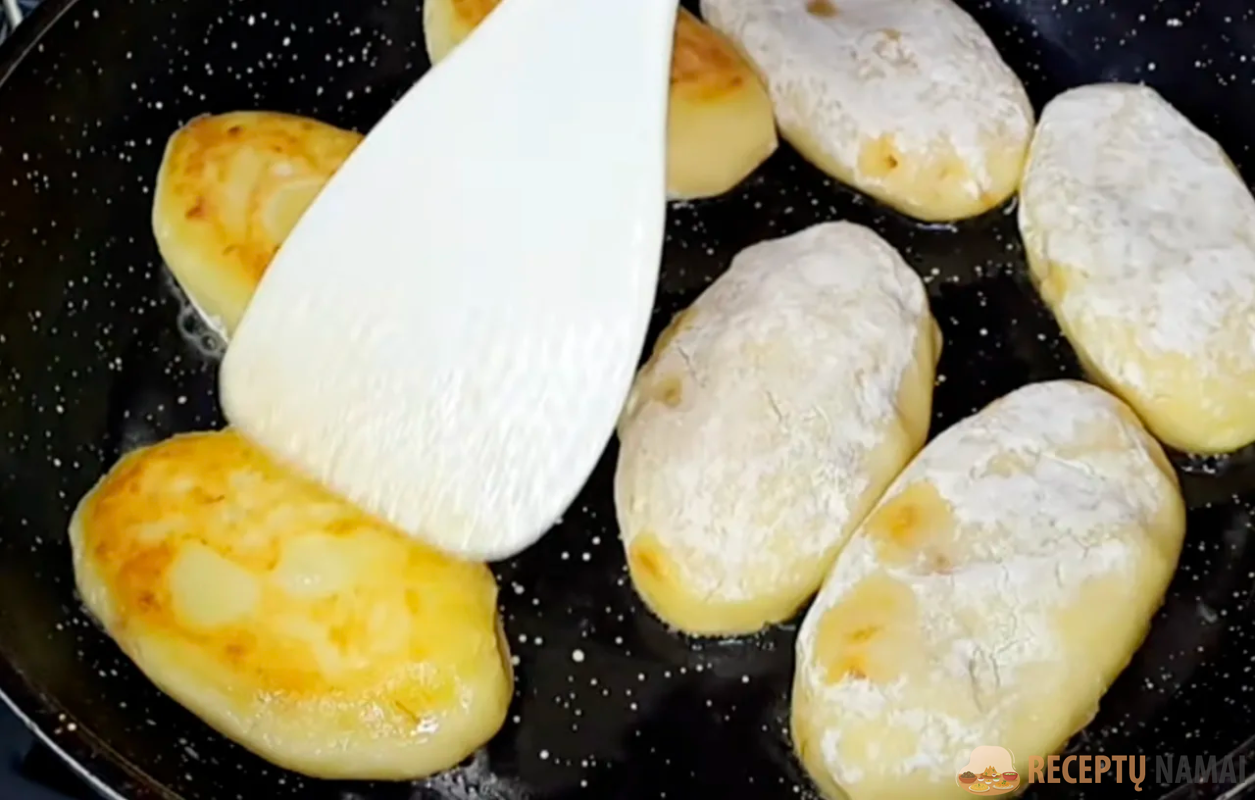 Tešla. Virtas bulves sutrinkite dar karštas su druska. Atvėsinkite, kol sušils. Įmuškite kiaušinį, įmuškite krakmolą ir miltus. Minkykite minkštą, nelipnią tešlą.