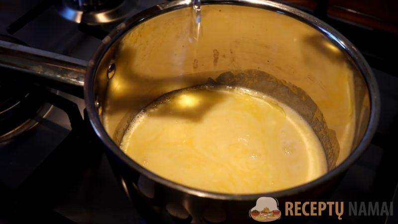 1. Paruoškite choux tešlą: ištirpinkite 80 g sviesto keptuvėje ant vidutinės ugnies. Tada supilkite pieną ir vandenį, išmaišykite. Supilkite 1/2 arb. š. druskos. Atskirame dubenyje sumaišykite miltus ir kepimo miltelius. Kai skystas mišinys užvirs, supilkite miltus ir kepimo miltelius.
