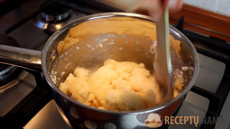 2. Tiesiai keptuvėje iškočiokite tirštą choux tešlą. Kruopščiai išmaišykite mentele, tada nukelkite nuo ugnies ir leiskite atvėsti.