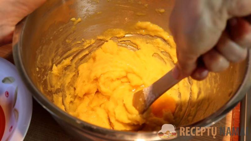3. Į atvėsusį mišinį įmuškite 4 kiaušinius. Mišinys bus tirštas ir standus.