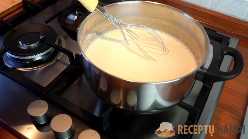 6. Paruoškite kremą: į puodą supilkite pieno, cukraus, kiaušinių ir miltų mišinį. Išmaišykite plakikliu ir virkite ant silpnos ugnies, kol užvirs. Kai užvirs (paviršiuje pasirodys burbuliukai), virkite dar 3 minutes ir išjunkite. Visiškai atvėsinkite.
