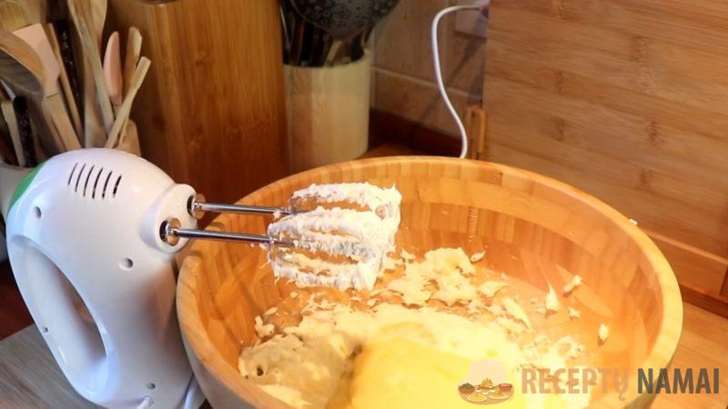 7. Suminkštintą sviestą plakite mikseriu, kol taps purus. Po šaukštą į sviestą įmaišykite šaltą grietinėlę.