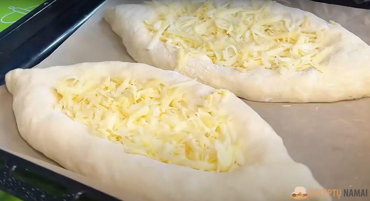 Prieš kepdami būtinai padarykite nedidelę skylutę apvalaus chačapurio centre ir viršų apibarstykite sūriu.