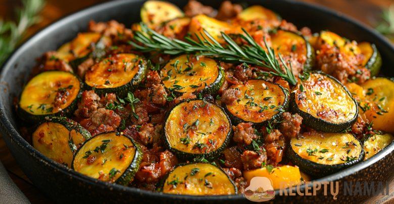 Aliejumi išteptoje formoje sudėkite cukinijų sluoksnį, paskirstykite pusę mėsos įdaro.