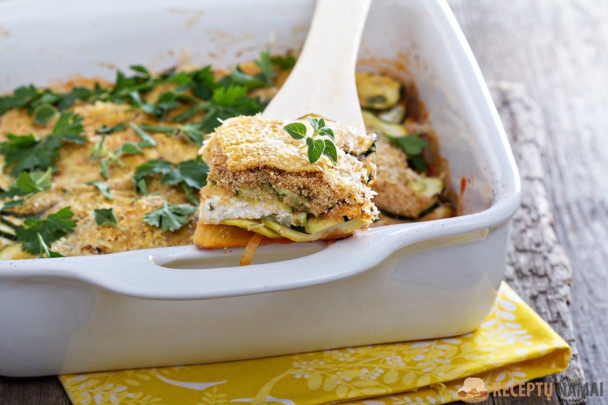 Kai ingredientai paruošti, galima pradėti formuoti apkepą. Kepimo formą reikėtų patepti sviestu arba alyvuogių aliejumi, pabarstyti džiūvėsėliais, kad patiekalas nepriliptų. Į formą sluoksniuojamos cukinijos, ant jų dedama rikotos masė, pagardinta kiaušiniais, sūriu, česnaku ir žolelėmis. Kartokite sluoksnius, kol sunaudosite visus produktus, o viršų pabarstykite papildomu tarkuotu sūriu, kad kepant susidarytų auksinė plutelė. Kepkite 180 laipsnių įkaitintoje orkaitėje apie 40 minučių, kol apkepas taps tvirtas ir gražiai apskrus. Viena svarbi detalė – prieš pjaustant patiekalą reikėtų bent 10 minučių palaukti, kad jis šiek tiek sustingtų ir gabalėliai būtų lengviau išimami.