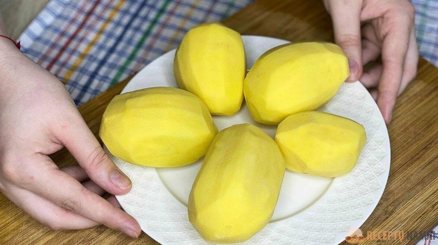 . Visas bulves išvirkite vandenyje su druska, pipirų grūdeliais ir lauro lapu. Bulves