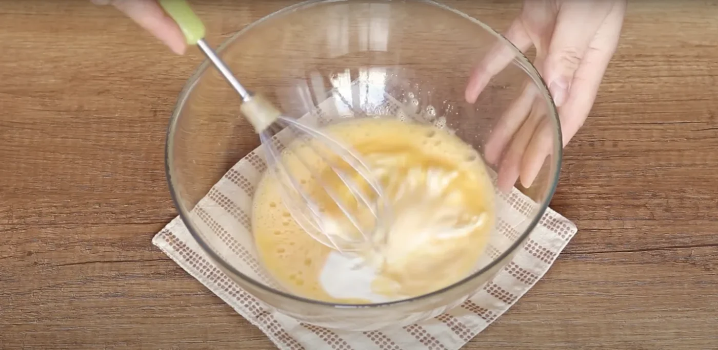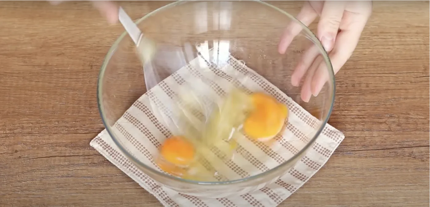 Įmuškite kiaušinius į dubenį ir išplakite šakute.