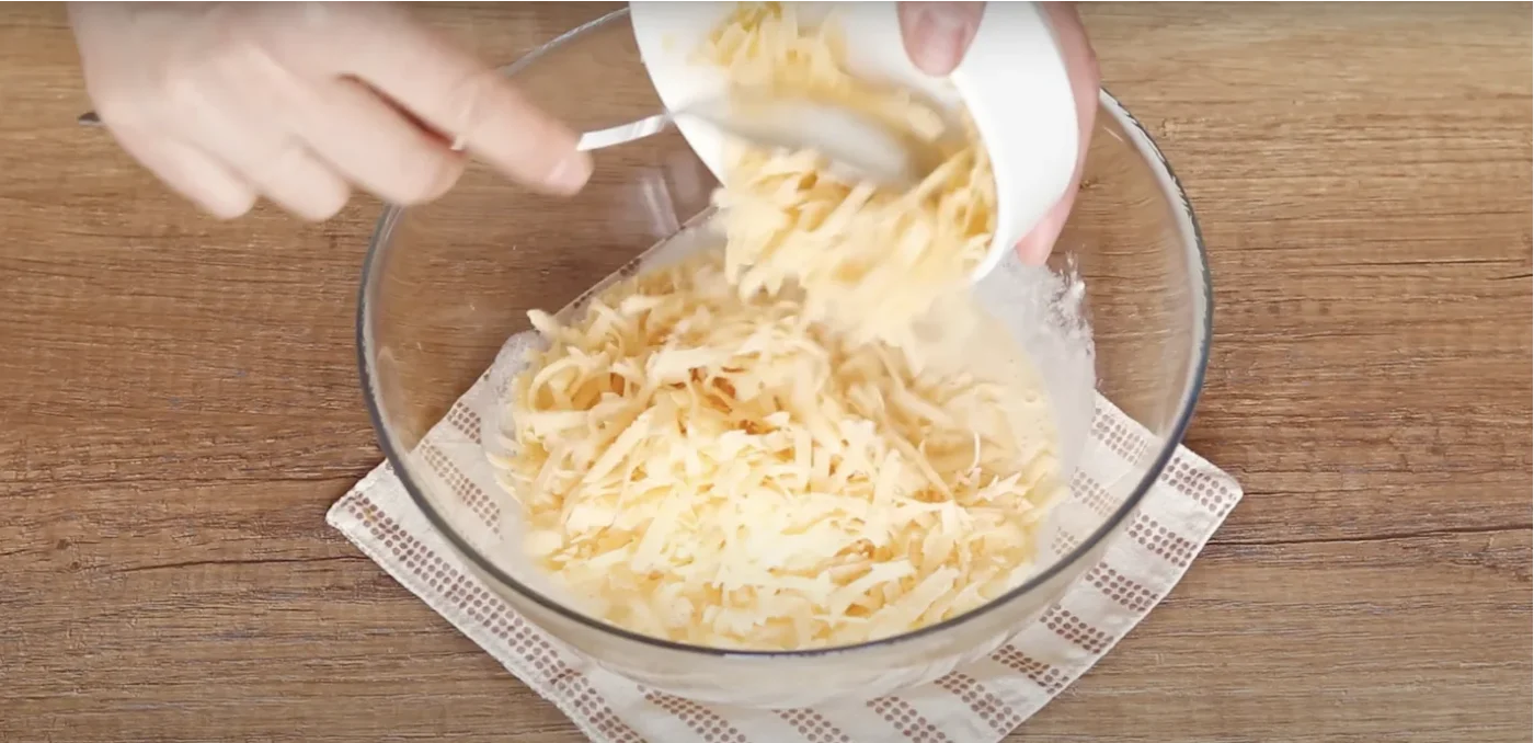 Sutarkuokite kietąjį sūrį ir sumaišykite su kiaušinių mišiniu.