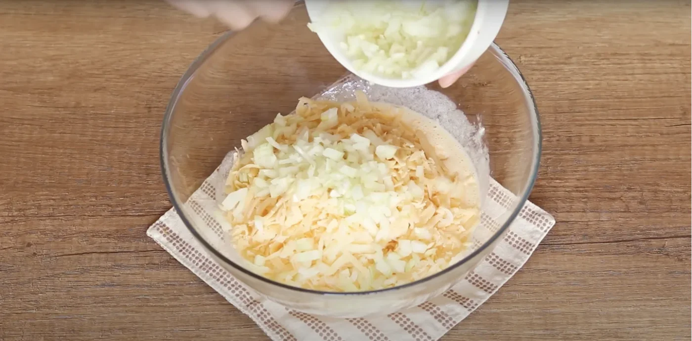 Svogūną supjaustykite mažais kubeliais ir suberkite į dubenį.