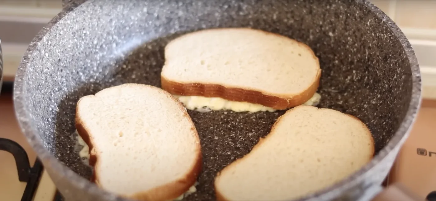 Keptuvėje įkaitintame aliejuje apkepkite mūsų sumuštinius. Apverskite juos ir dar kelias sekundes palaikykite ant ugnies.