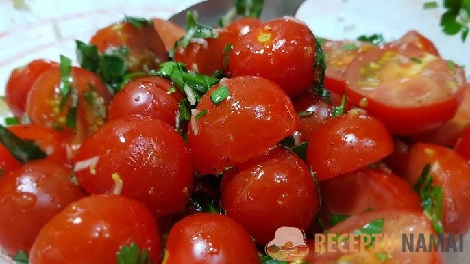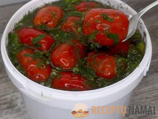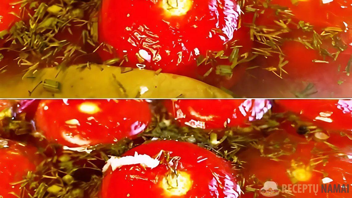 Jei norite, galite pridėti aitriųjų paprikų ir kai kurių kitų daržovių. Jums patiks šis skanus pomidorų užkandis!