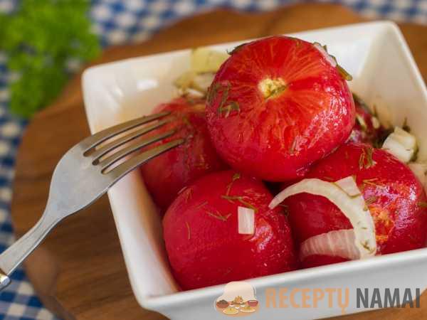 2. Leiskite marinatui atvėsti. Nuo pomidorų bet kokiu būdu pašalinkite odeles (galite padaryti įpjovas ir pomidorus užpilti verdančiu vandeniu). Įsitikinkite, kad jos liko nepažeistos.