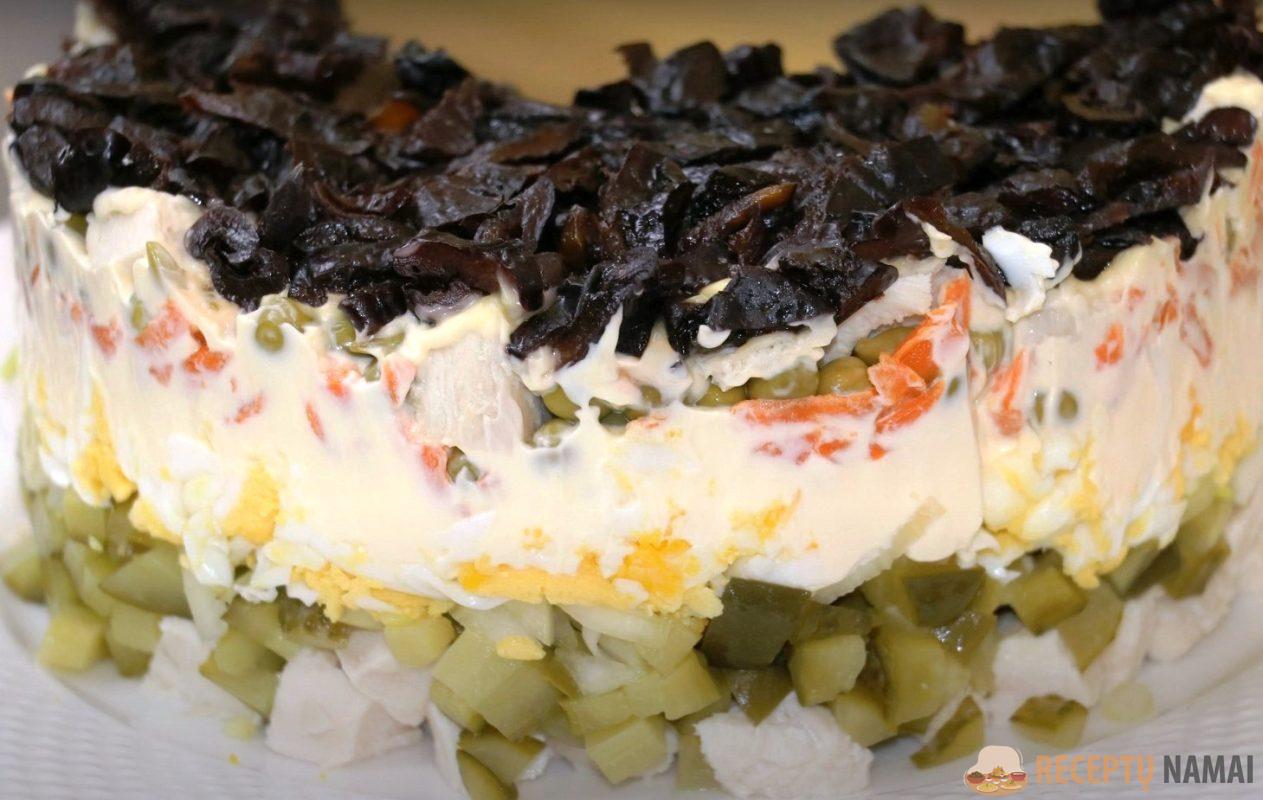 Sluoksnius patepkite majonezu, išdėliokite morkų sluoksnį. Salotų sluoksnius papildykite džiovintomis slyvomis ir česnakais, paskutinį sluoksnį patepkite majonezu.