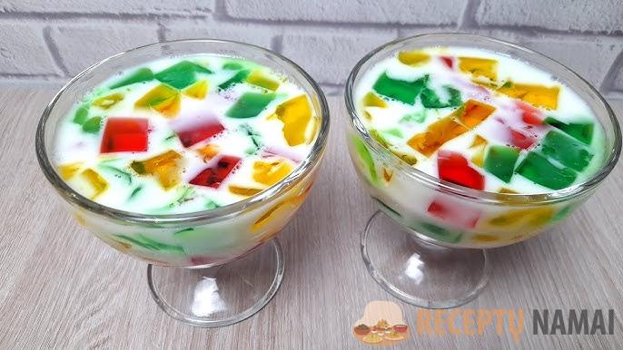 1. Paruoškite vaisių želė: supilkite ją į karštą vandenį (75–80 laipsnių Celsijaus) ir gerai išmaišykite, kol visiškai ištirps. Kad želė būtų tvirtesnė, naudokite pusę ant pakuotės nurodyto vandens kiekio.
