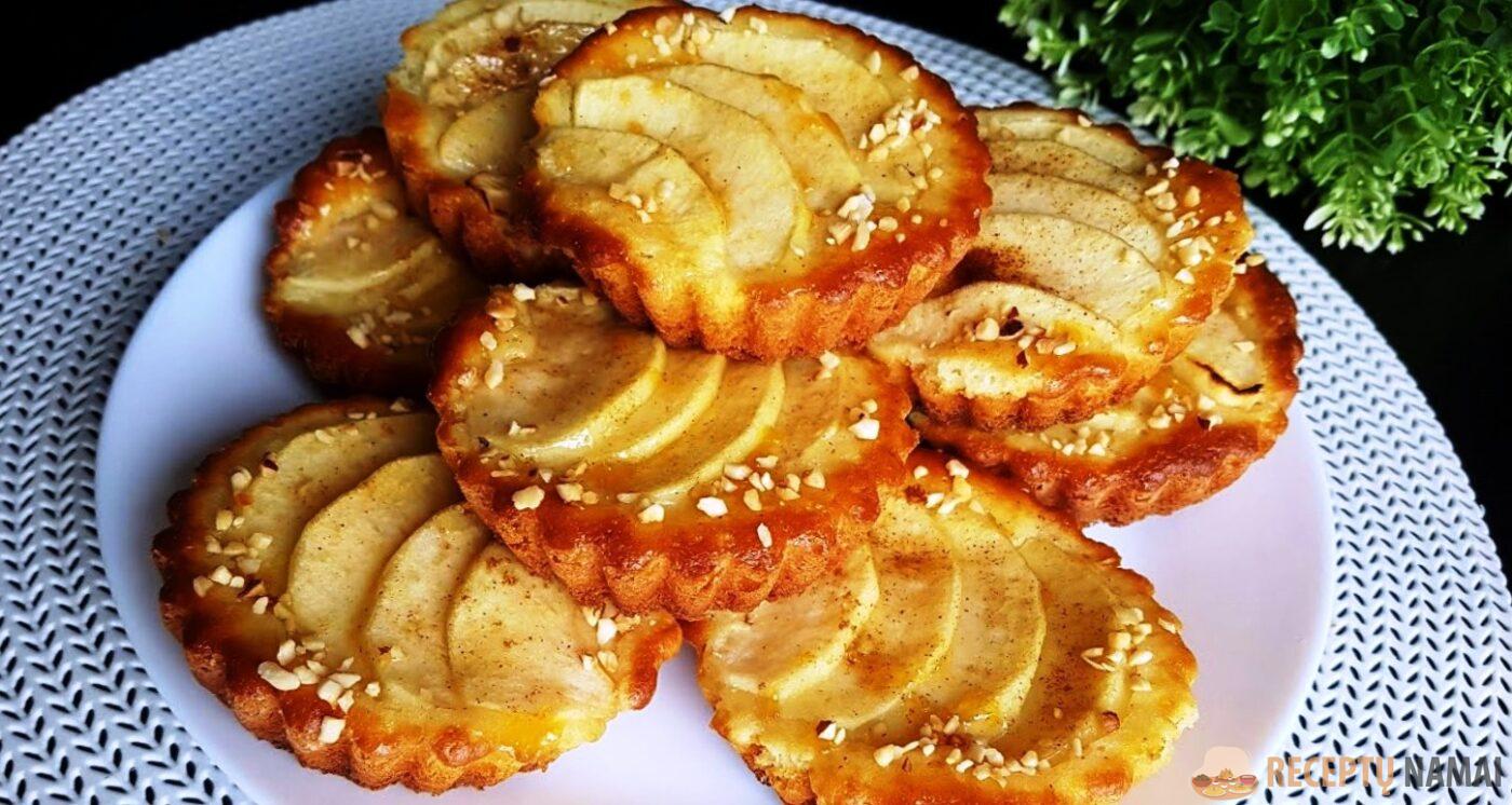 Tešlą paskirstykite į krepšelius arba keksiukų formeles po vieną šaukštą, ant viršaus uždėkite obuolių skiltelių, pabarstykite cukrumi ir cinamonu.