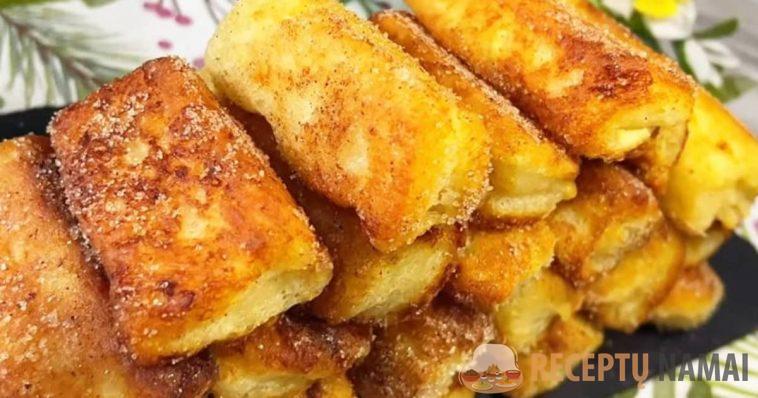 Plokščiame dubenyje sumaišykite cukrų su cinamonu ir susukite gatavus batonėlius. Skanaus!