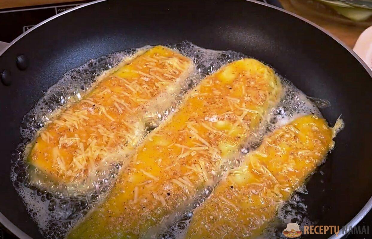 Sudėkite apvoliotas cukinijas į keptuvę su aliejumi ir apkepkite iš abiejų pusių, kol taps auksinės spalvos.