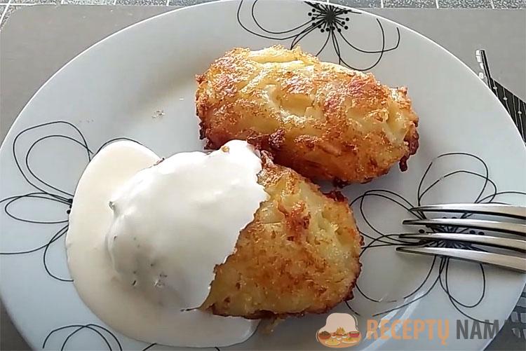 Nuskustas bulves sutarkuokite stambia tarka, užpilkite šaltu vandeniu ir palikite mirkti apie 5 minutes, kad pasišalintų krakmolo perteklius. Tada nupilkite vandenį, išspauskite bulves ir nusausinkite likusią drėgmę.